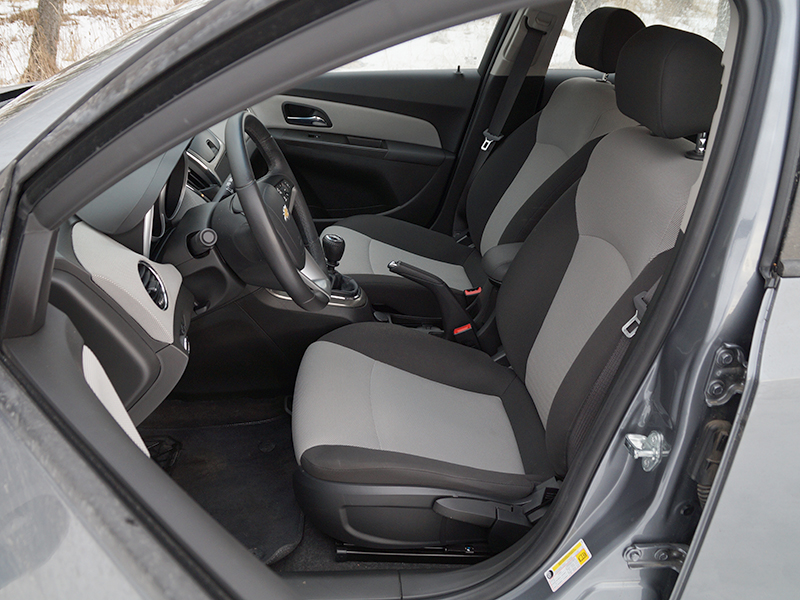 Фото Chevrolet Cruze (2012 - 2014) поколение J300 рест. - Передние сиденья широкие, боковой поддержки почти нет. Цвет обшивки такой же, как у тканевых вставок на панели и дверях