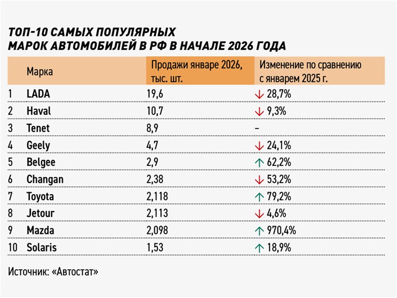 Так, впечатляющий рывок в начале года сделала марка Tenet, которая только осенью 2025 года приступила к выпуску машин на бывшем заводе Volkswagen под Калугой. В январе спрос на автомобили этого бренда достиг отметки 8,9 тыс. единиц, марка заняла уже значимые 11,1% рынка и почти догнала прежнего лидера среди иномарок — Haval, который развивает свой завод под Тулой и закончил январь с показателем 10,7 тыс. авто (на 9% ниже января прошлого года).