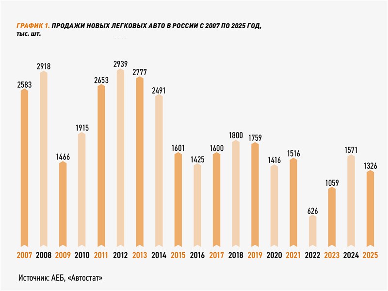 1,326 млн проданных новых легковых автомобилей, что на 15,6% меньше, чем в 2024 году, — с этим результатом российский авторынок подъехал к финишной черте ушедшего года, подсчитало аналитическое агентство «Автостат». Такие показатели контрастируют с динамикой последних двух лет, когда, напомним, в 2024 году рынок год к году вырос на 49%, а в 2023 м подскочил аж на 70% (см. график 1).
