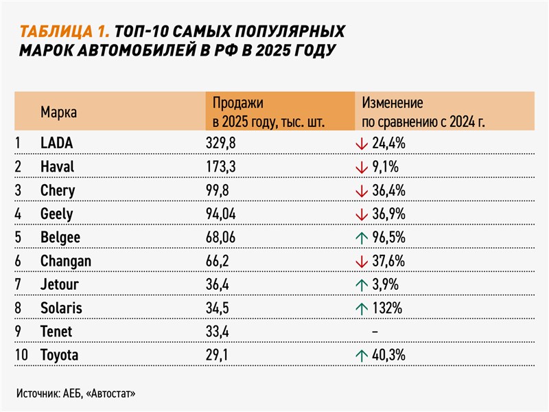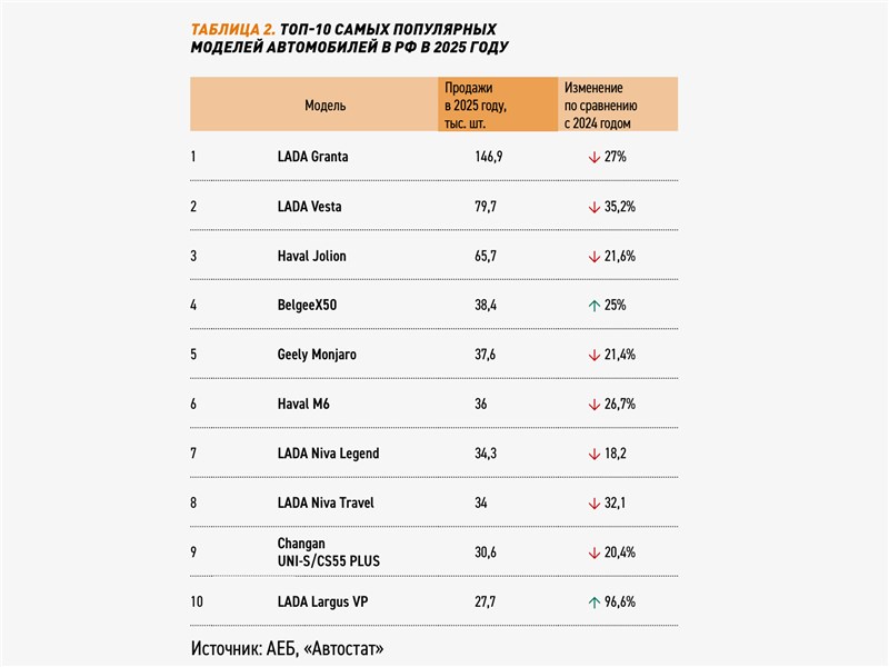 В модельном же зачете четвертый год подряд лидерство принадлежит автомобилям семейства LADA Granta, которые в 2025 м разошлись тиражом 146?990 экземпляров. Второе место занимает LADA Vesta (79?796 шт.), а лучшей иномаркой в РФ остался кроссовер Haval Jolion с результатом 65?757 единиц. В первую десятку вошли еще три отечественные, три китайские и одна белорусская модель. При этом в плюсе тут находятся только кроссовер Belgee X50 (+25%) и пассажирский универсал LADA Largus (+96,6%). Остальные восемь моделей показывают снижение, а самое сильное оно у Vesta (–35,2%, см. таблицу 2).