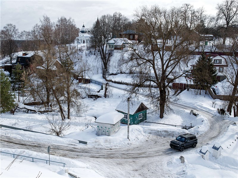 В Тарусе вообще все близко, расстояние между «Частной территорией» и Домом литераторов, куда мы отправились на следующее утро, меньше трех километров, однако зимой преодолеть их не так просто. Если по пути захочется осмотреть Воскресенскую церковь и окунуться в купель неподалеку, без полного привода не обойтись: за крутым спуском следует такой же высокий подъем, да еще с поворотом, а местные коммунальщики едва успевают расчищать центральные дороги. Так что внедорожные способности Jetour T1 нам не раз пришлось проверить уже в городе: включаем режим «снег», без проблем забираемся на горку и протискиваемся между сугробами по узким переулкам, объезжая застрявшие в колее легковушки.