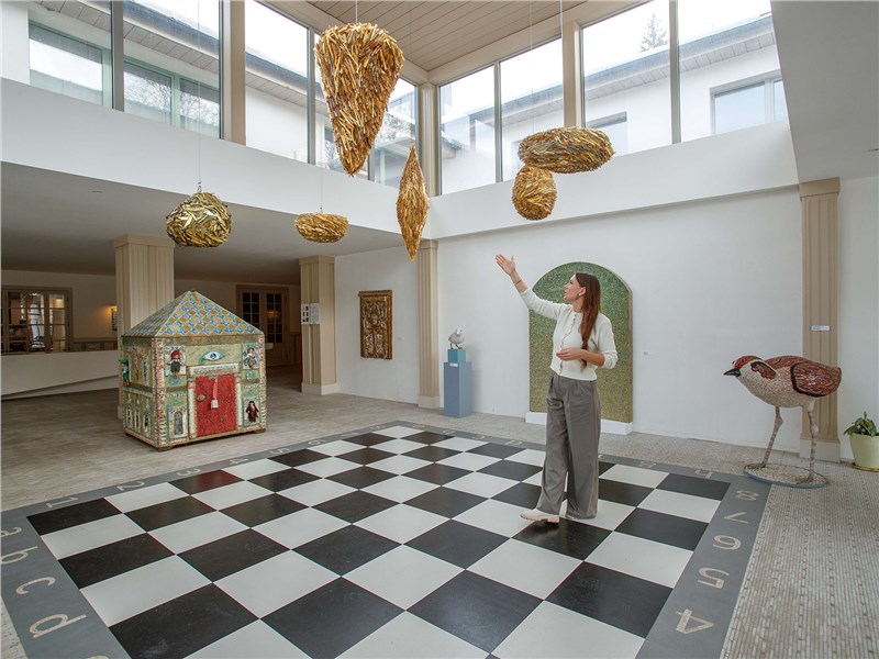 Сверкающие «гнезда» из золотой смальты свисают с потолка над шахматным полом: придать мозаике объем — одна из оригинальных идей художника. В свое время Марко осмелился пойти наперекор тысячелетней традиции, бросить вызов стереотипам и сумел объединить древнюю технику с современным искусством. Его работы настолько уникальны, что сложно бывает узнать в них одного автора — причудливый орнамент метр на метр оказывается просто подписью, а в концертном зале на стенах развешаны «иконы природы» в виде деревьев на каноническом золотом фоне.