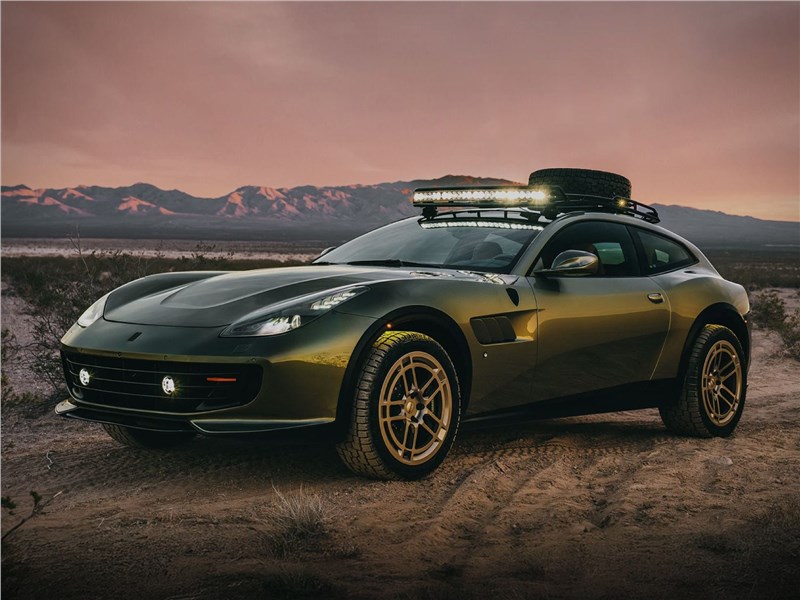 Жеребец из Маранелло, гарцующий по дюнам? Теперь это не оксюморон. Ребята из американской компании GlasWerks постарались превратить низкосидящий полноприводный Ferrari GTC4Lusso в птицу куда более высокого полета. В прямом смысле итальянского слова Elevato («Приподнятый») в том числе. После доработки клиренс увеличился почти вдвое до вполне оффроудных 230 мм. Лифт подвески выполнили по полной программе, установив фрезерованные алюминиевые рычаги, усиленные тяги, пружины от Eibach и регулируемые амортизаторы MCS 3WR. Пришлось расширить и колесные арки, чтобы туда поместились кованые колесные диски Forgeline с внедорожными покрышками Pirelli Scorpion All Terrain Plus. Регулировать давление в них прямо из салона позволяет установленная в грузовом отсеке система подкачки. И уж раз такое дело, то и оранжевые буксировочные скобы у Elevato совсем не бутафорские. Как и усиленная защита днища. Законченность облику модели придают экспедиционный багажник и «люстра» на покатой крыше. А поскольку вдали от цивилизации ночью много света не бывает, то Elevato получил и основные светодиодные фары увеличенной яркости плюс пару дополнительных. Доработки утяжелили модель на какой-то десяток кг, да и этот «довесок» компенсируется увеличением мощности 6,3 литрового V12 с 690 до 758 л.с. после установки нового впускного коллектора и блока управления.
