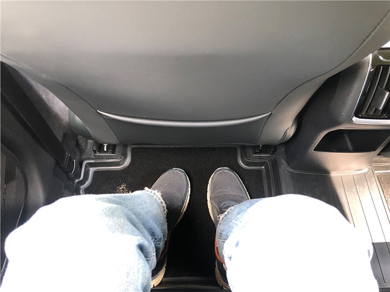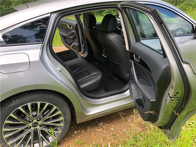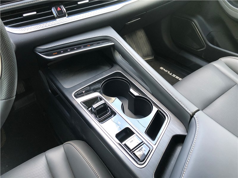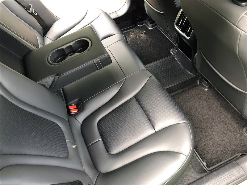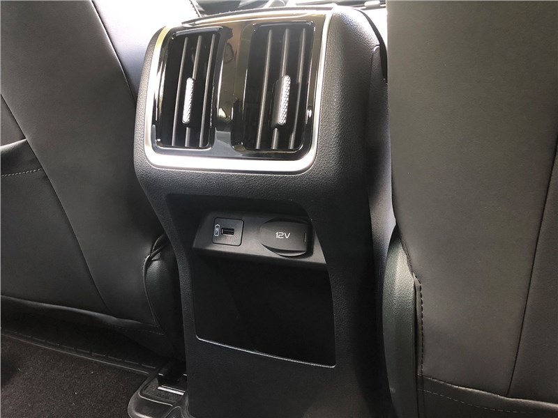 На новом центральном тоннеле есть площадка для беспроводной зарядки смартфона, селектор КПП стал совсем небольшим тумблером. Задний ряд такой же просторный, из удобств здесь – откидной подлокотник с подстаканниками, дефлекторы вентиляции, USB-разъем, розетка 12V, небольшая ниша для мелочей.