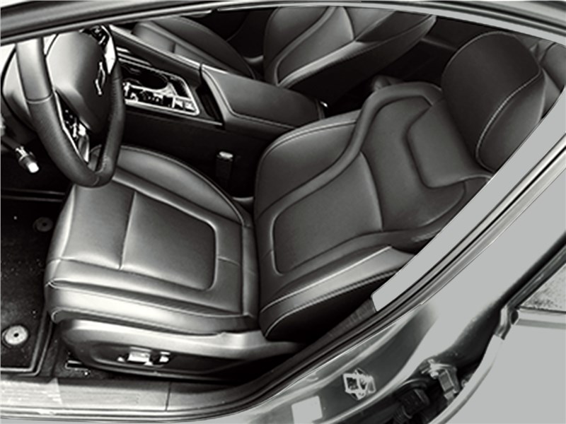 Что внутри? Тот же, хоть и с новой эмблемой, мультируль со срезанным низом и с регулировкой только по высоте. Спинку водительского кресла можно бы и удлинить, а то ее верхний валик упирается в середину лопаток. Поясничного подпора нет. А вот диапазон регулировки по высоте у подушки большой, можно сесть по-спортивному, низко, с руками параллельно земле, вытянутыми к рулю, а можно поднять сиденье высоко, запас места над головой есть, до потолка далеко. Потолок в Bestune B70, кстати, светлый, пластик в отделке салона черный, а кожзам серый и черный. Передние кресла с подогревом, которые включаются через экран.