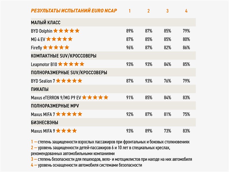 Также классовые рекорды Euro NCAP, зафиксированные по действовавшим с 2023 года правилам, на счету: ситикара Firefly (96%) и бизнесвэна Maxus MIFA 9 (93%) во «взрослой» дисциплине, компактного кроссовера Leapmotor B10 (93%) и полноразмерного SUV BYD Sealion 7 (93%) — в «детской». Городские компакты BYD Dolphin и MG 4 EV (по 85%), минивэн Maxus MIFA 7 (81%), а также пара пикапов-близнецов Maxus eTERRON 9 и MG P9 EV (84%) лучше других «одноклассников» берегут здоровье пешеходов, велосипедистов и мотоциклистов.