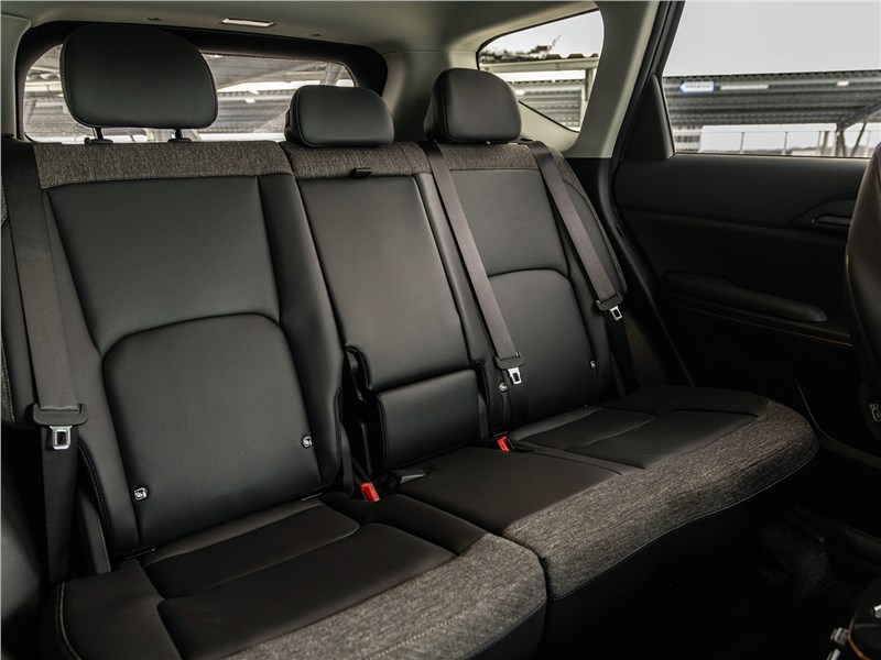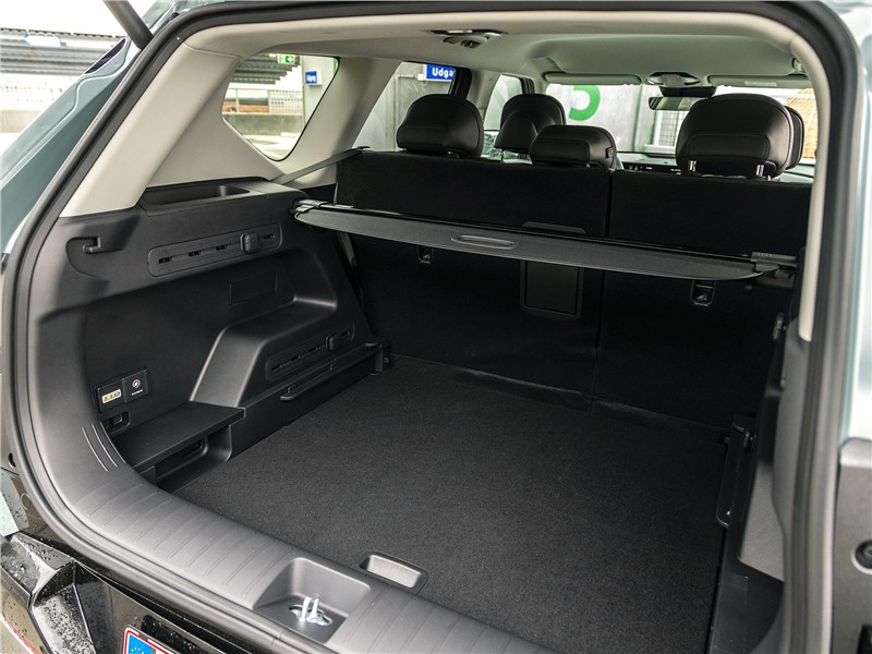 Размеры салона впечатляют. Человек ростом 183 см может сидеть «сам за собой» с достаточным запасом пространства в коленях, а ровный пол сзади позволяет разместить троих пассажиров. Много места и над головой. Объем багажника составляет достойные 566 л, при этом пол здесь регулируется по высоте. Дополнительный отсек под капотом объемом 44 л предназначен для хранения зарядного кабеля.