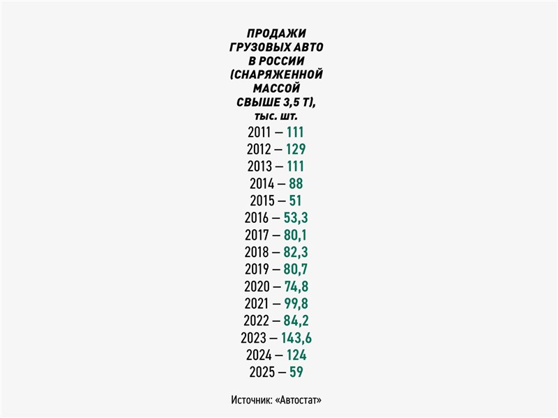 Сокращение спроса на рынке коммерческих авто в России началось в 2024 году, и поначалу его связывали с предыдущим взлетом продаж. Напомним, что в 2023 году реализация грузовых машин в РФ показала не просто выдающиеся показатели, а достигла исторического рекорда со времен СССР. По данным «Автостата», тогда в РФ было реализовано 143 тыс. грузовиков, что на 70% превышает показатель 2022 года. Таким образом, два года назад рынок заехал выше самого результативного года в постсоветский период, когда в 2012 м было продано 129 тыс. грузовых авто. Но в 2024 м рынок съехал — правда, тогда на незначительные 4% до отметки в 124 тыс. авто. А в прошлом году падение серьезно усилилось.