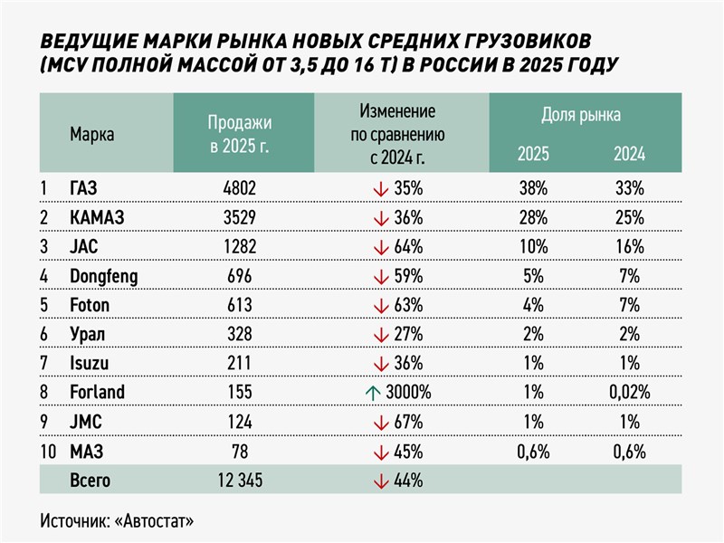 В сегменте средних грузовиков лидерство принадлежит отечественной марке ГАЗ, что составляет 4,8 тыс. реализованных экземпляров. Нижегородское предприятие здесь также сумело увеличить долю, достигнув 38% продаж против 33% годом ранее. За ним следует российский КАМАЗ (3,52 тыс.) с долей 28% (ранее 25%). Далее в топ-5 попали «китайцы» — JAC (1,28 тыс., доля 10%, ранее 16%), Dongfeng (696 шт., 5% против 7% ранее) и Foton (613 шт., 4% и 7% ранее).
