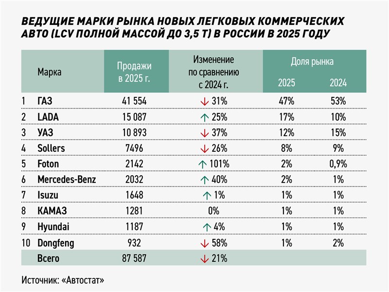 Что же касается легких коммерческих автомобилей, то около половины (47%) рынка LCV также принадлежит отечественной марке ГАЗ (это составляет 41,5 реализованных экземпляров). Но здесь наблюдается снижение доли — в 2025 году нижегородцы имели 53% продаж. Следом идут другие российские бренды LADA (15 тыс.), УАЗ (10,8 тыс.) и Sollers (7,4 тыс.). При этом LADA сумела увеличить долю рынка, в то время как УАЗ и Sollers ее немного снизили. Лучшим же среди иномарок в сегменте LCV является китайский Foton, который в 2025 году сумел более чем вдвое нарастить продажи легких коммерческих машин (+101,9%). Положительная динамика также отмечена у Mercedes-Benz (+40,9%), LADA (+25,4%), Hyundai (+4,2%) и Isuzu (+1,7%). Результаты КАМАЗа повторяют показатель 2024 года. Остальные четыре марки демонстрируют снижение, а самое глубокое отмечено у Dongfeng (-58,6%). При этом продажи УАЗа сократились на 37,7%, ГАЗа — на 31,2%, а Sollers — на 26,5%.