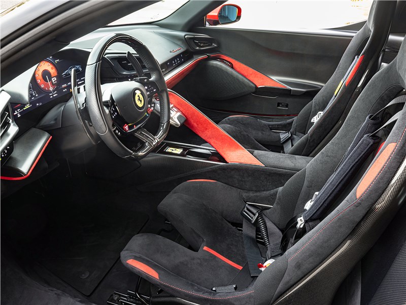 Внутри новинка похожа на SF90 Stradale, но при этом есть два важных отличия. Во-первых, теперь на руле имеются полноценные кнопки, а не сенсорный экран (это улучшение было внедрено во всей линейке Ferrari). А во-вторых, панель выбора передач перемещена выше: она «парит» недалеко от руля, что делает ее гораздо более удобной. Единственная претензия к эргономике — водительское кресло хотелось бы опустить пониже. Ну и то, что из-за расположенных спереди электромоторов багажника здесь, по сути, нет, не добавляет модели практичности.